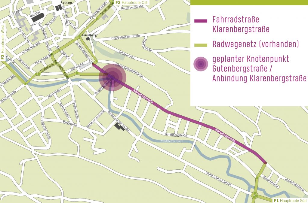 Die Stadtteile West, Ost und Süd sollen laut vom Gemeinderat beschlossenen Radwegezielplan über drei Achsen an die Altstadt bzw. einen Altstadtring für den Radverkehr durchgängig angeschlossen werden: Die Klarenbergstraße (F1, Hauptroute Süd), Wilhemstraße und Werrenwiesenstraße (F2, Hauptroute Ost), Römerstraße und Schwerzerallee (F3, Hauptroute West).