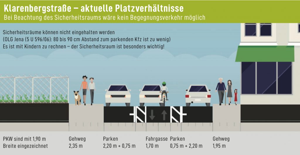 - Breitere Fahrgasse, Parken nur noch talwärts, wodurch ca. 40 Stellplätze entfallen, dadurch ausreichende Sicherheitsräume